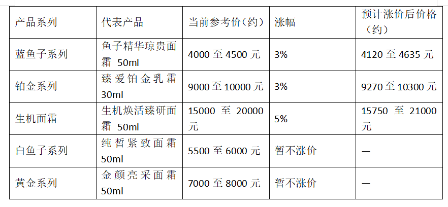 近日,中国商报记者获悉,德国化妆品巨头拜尔斯谈夫集团旗下高端护肤品牌莱珀妮(La Prairie)将于本年4月在中国阛阓上调部分居品价钱,涨幅在3%至5%之间。