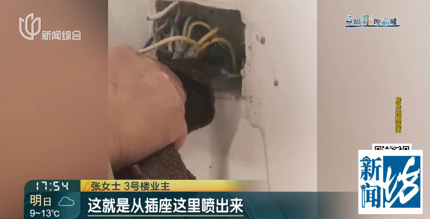 3号楼业主 张女士:这是咱们家的情况,那时说来排查来望望有莫得水,目前水是哗喇喇地流出来的,肉眼王人不错看见的,便是从插座这里喷出来,水王人是乌黑乌黑的,每个房间王人有水的,顺着墙往下游。