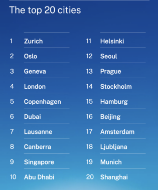 该指数的一个特有之处在于,它有利弱化硬数据,强调城市生涯的“东谈主”的维度——通过对每个城市约400名住户的造访收尾进行料想打算,作念出一个更雷同智能城市“宜居性”的名次。