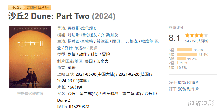 《沙丘2》更是在豆瓣上稳拿8.1分,烂番茄簇新度高达93%,叫好又叫座,径直把续作的期待值拉满 。