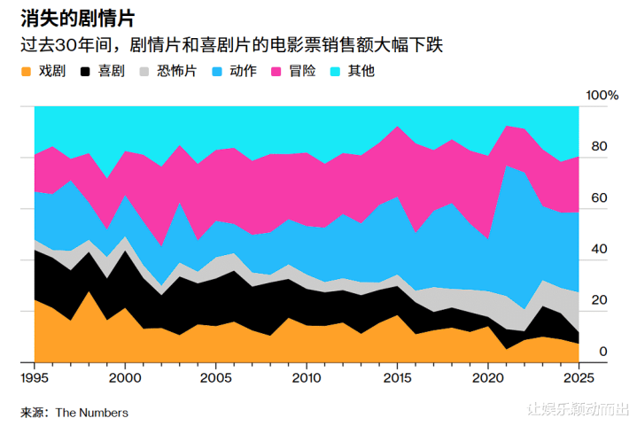 如今制片厂喜爱的类型是动作片、冒险片、恐怖片,酣醉于借助现存IP拍稳赚不赔的续集,或者拍低本钱的类型片,从电影票房分拨来看,剧情片和笑剧片降幅深广。