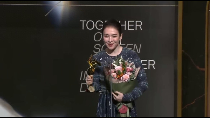 她说的第一句是“感谢亚洲电影大奖,感谢尊敬的王主席。”