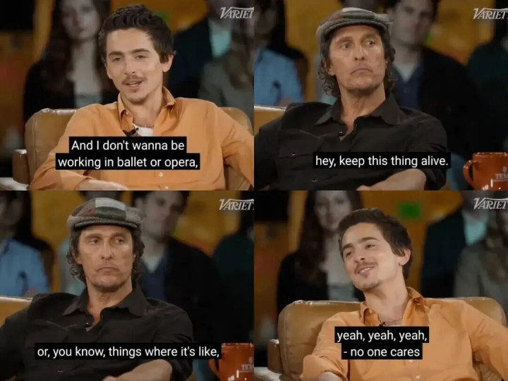 2月底,相同是为了宣传《至尊马蒂》,甜茶和奥斯卡影帝马修·麦康纳在《综艺》杂志作念了一次对谈。在筹商不雅众防备力缺失的话题时,为了强调在影院不雅影的不行替代性,他直肚直肠:“我可不念念去歌剧院或者芭蕾舞团使命……这世上根底依然没东谈主再温雅这些东西了。”天然,他随机意志到欠妥,立即找补——“我对芭蕾和歌剧从业者充满敬意”,以致还自嘲“刚才可能失去了14%的不雅众”。