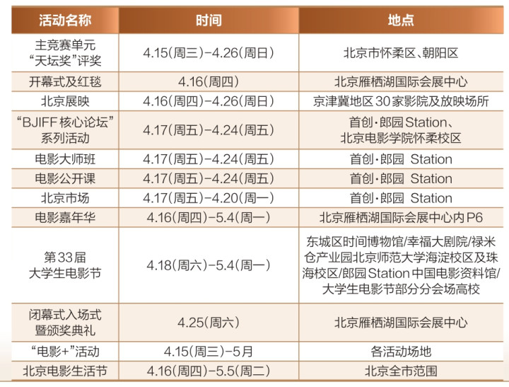 天坛映百花,光影耀京华。第十六届北京海外电影节将于4月16日至4月25日举办。本届电影节将围绕“天坛奖”评奖、开幕式、北京展映、BJIFF中枢论坛系列活动、北京市集、电影嘉年华、第33届大学生电影节、终结式暨受奖庆典、“电影+”、北京电影生活节等中枢板块,推出一系列精彩纷呈的电影文化活动。