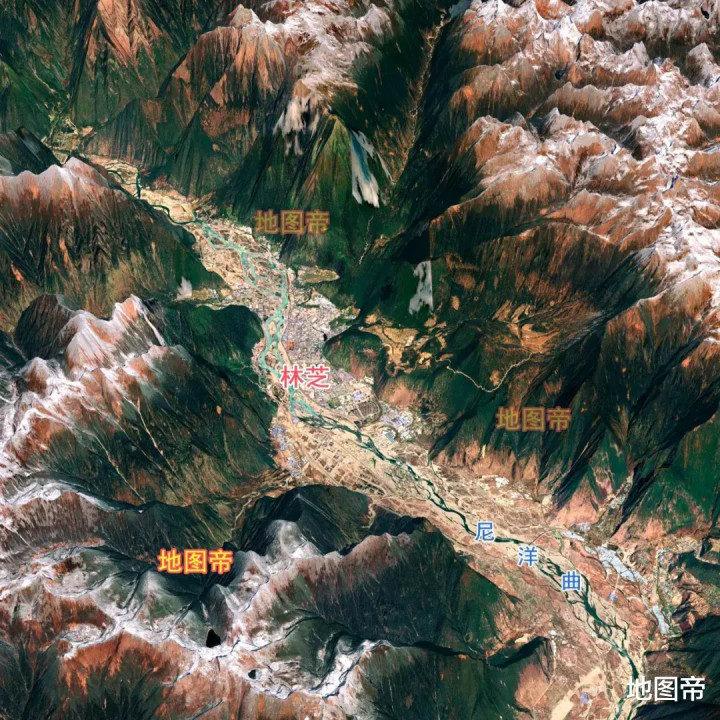 林芝地区北部为念青唐古拉山,南部下喜马拉雅山东段,西北部为冈底斯山余脉,东部系横断山脉,前三大山脉为东西走向,后者多为南北走向。平均海拔约3100米,地形自西北向东南歪斜,高差悬殊大,最岑岭是喜马拉雅山东端的南迦巴瓦峰,海拔7782米,最低点在雅鲁藏布江卑劣墨脱县巴昔卡,海拔155米,相对高差7627米。