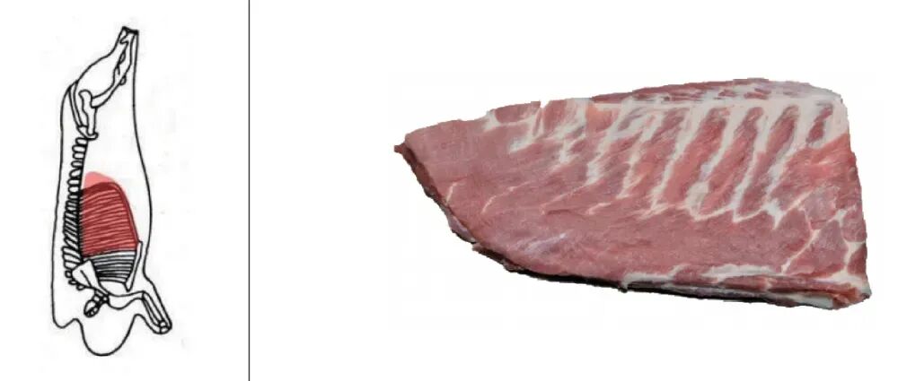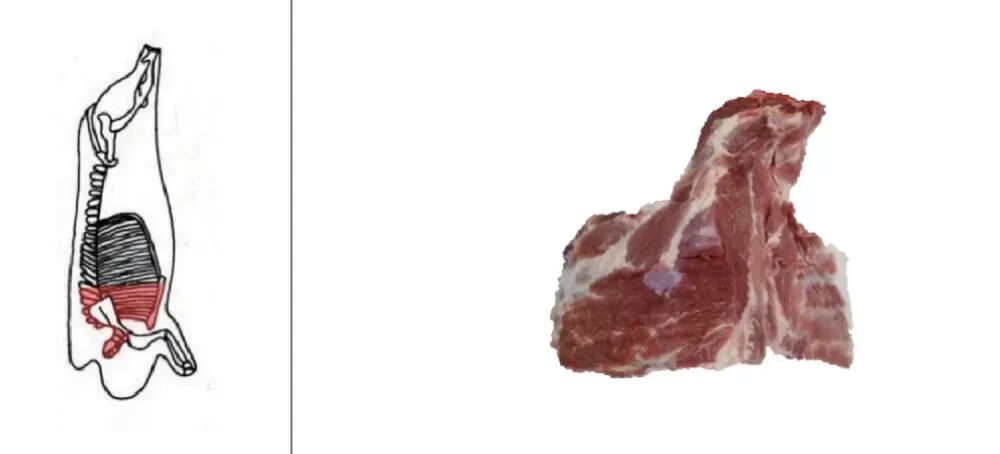 取自猪第五、第六椎间至颈椎部位脊骨,去除颈背肌肉,带胸骨和五根肋骨的部位肉。猪小排则是猪前排有肋骨部位,带肋骨5根~6根,去脊椎,硬胸骨,呈“A”字形的部位肉。猪前排不竭会带一丝软骨、筋膜和更复杂的骨边结构,肉不算厚,但口感很丰富,既有肉香,也有软骨的脆嫩。