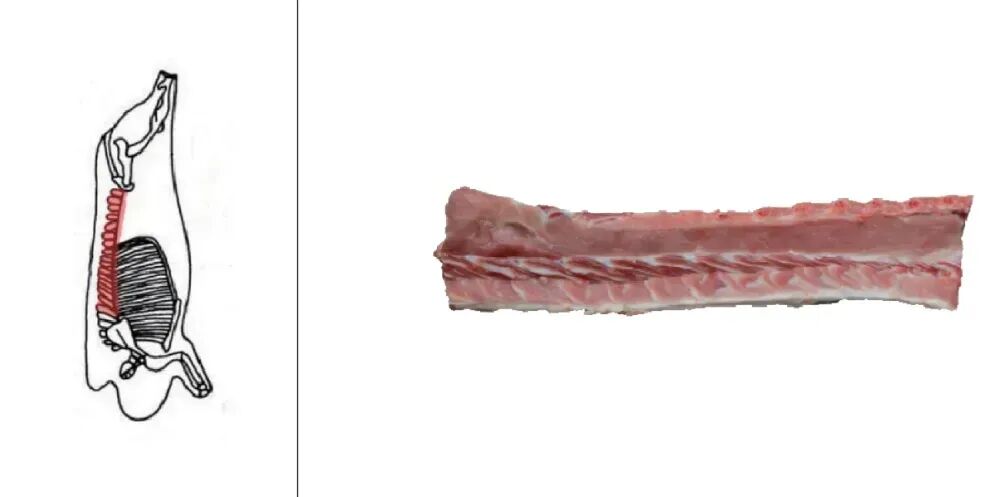 猪脊骨也叫猪龙骨、猪腔骨,自猪的第五、第六胸椎间至腰椎第四处锯断,并取出背最长肌,名义肉色呈鲜红色的骨头。骨头占比较高,肉相对少,肉质口感偏紧实,也即是常说的“有点柴”。
