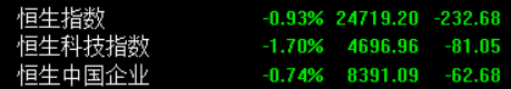 终了午间收盘,港股恒生指数跌0.93%,报24719.2点,恒生科技指数跌1.7%,报4696.96点,国企指数跌0.74%,报8391.09点,红筹指数跌0.6%,报4139.28点。