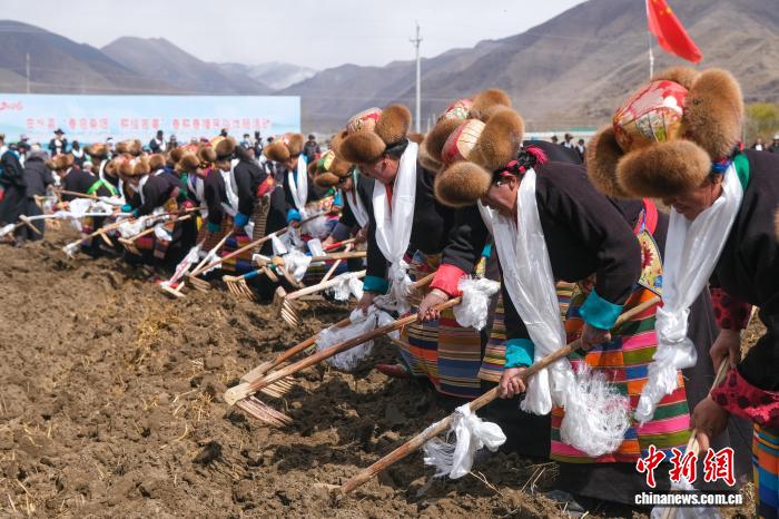 3月16日上昼,拉萨市曲水县达嘎镇色达村村民身着节日盛装,举行传统春耕举止。中新社记者 江飞波 摄
