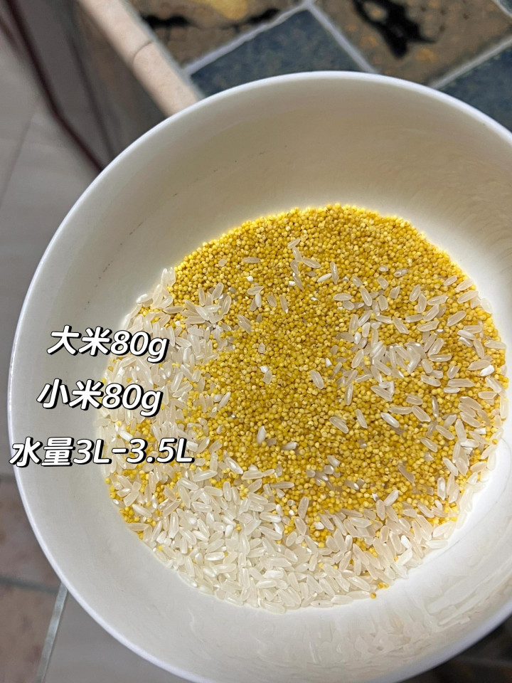 准备80克大米、80克小米。米无谓提前泡,洗洗干净就行。水要用到3升到3.5升,最佳用砂锅,保温好,熬出来也香。