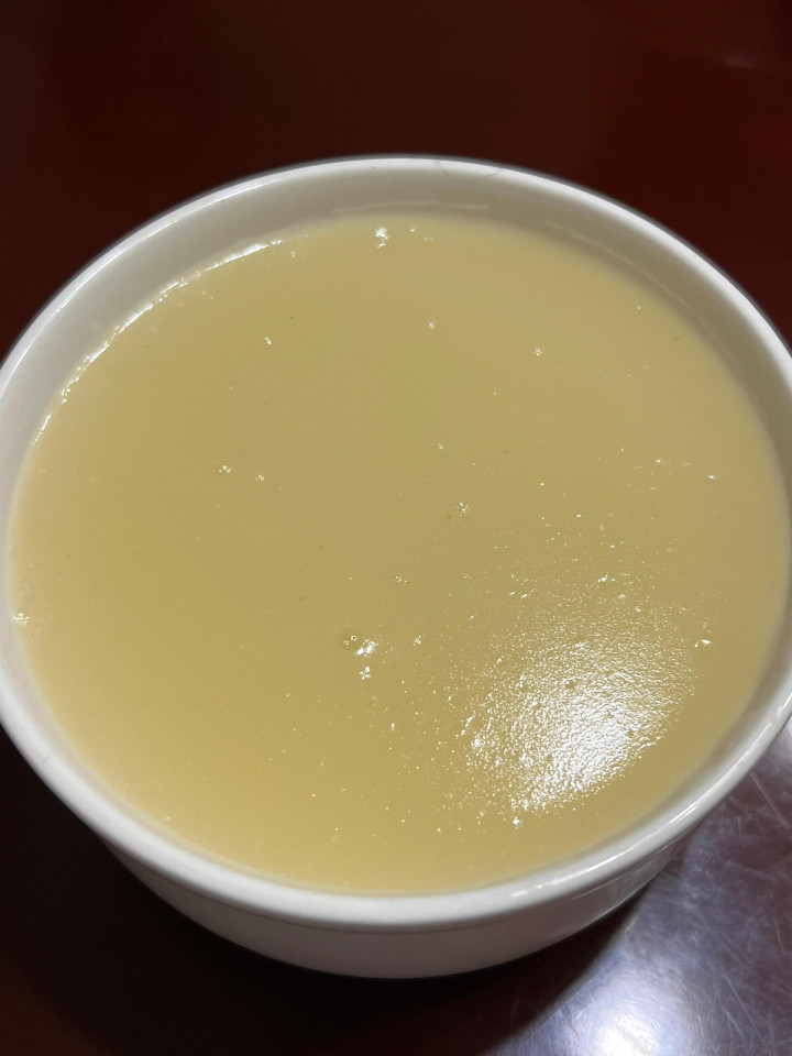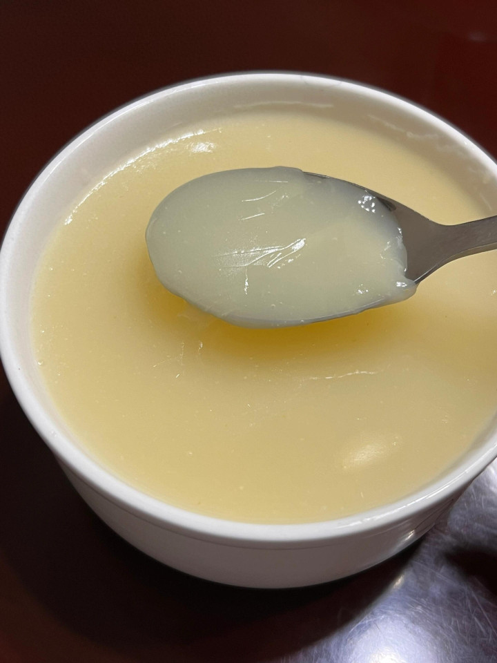 然后用漏勺把米油过滤出来,细心,径直倒出来就行,不要用勺子去压米,一压就把米渣压进去了,出来的就不纯了。这么滤出来的米油,刚熬好是稠稠的,放凉了之后,果真会像果冻相同,Q弹Q弹的。