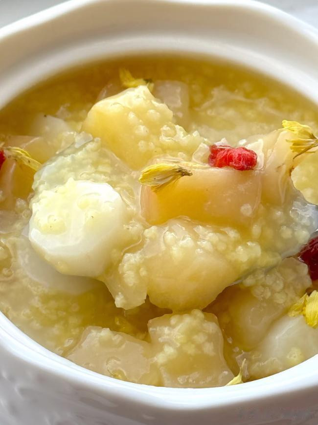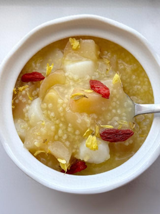 煮好的粥呈现出浅浅的米黄色,点缀着红色的枣和橘色的枸杞。进口是小米的顺滑,山药的粉糯,偶尔咬到一块苹果丁,酸甜软糯,带着自然的果香。无须加太多糖,食品自己的甜味就足以叫醒千里睡的味蕾。