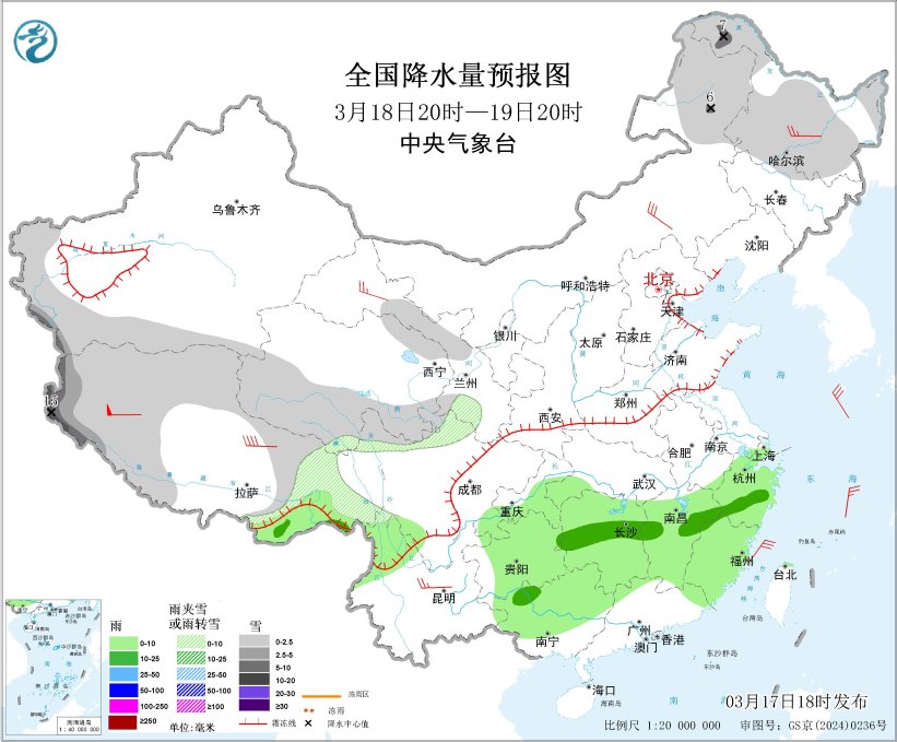 3月17日20时至18日20时,内蒙古东北部、东北地区大部、新疆南疆西部山区、西藏大部、西北地区中东部、川西高原等地部分地区有小雪或雨夹雪,其中,内蒙古东北部、黑龙江西北部、青海东部、甘肃南部、川西高原北部等地部分地区有中到大雪(5~8毫米)。西藏东南部、华北南部、黄淮大部、江淮、江汉大部、江南大部、西南地区东部、华南北部等地部分地区有小到中雨,其中,西藏东南部、云南西北部、贵州东北部、湖南西部等地部分地区有大雨(25~40毫米)。内蒙古中东部、黑龙江东北部、华北南部等地部分地区有4~6级风,西藏北部部分地区有7~8级风;渤海、渤海海峡、黄海北部和中部海域有6~7级风,阵风8级(见图1)。