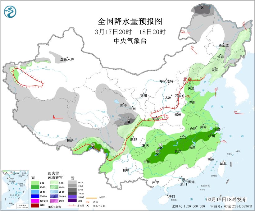 图1 宇宙降水量预告图(3月17日20时-18日20时)