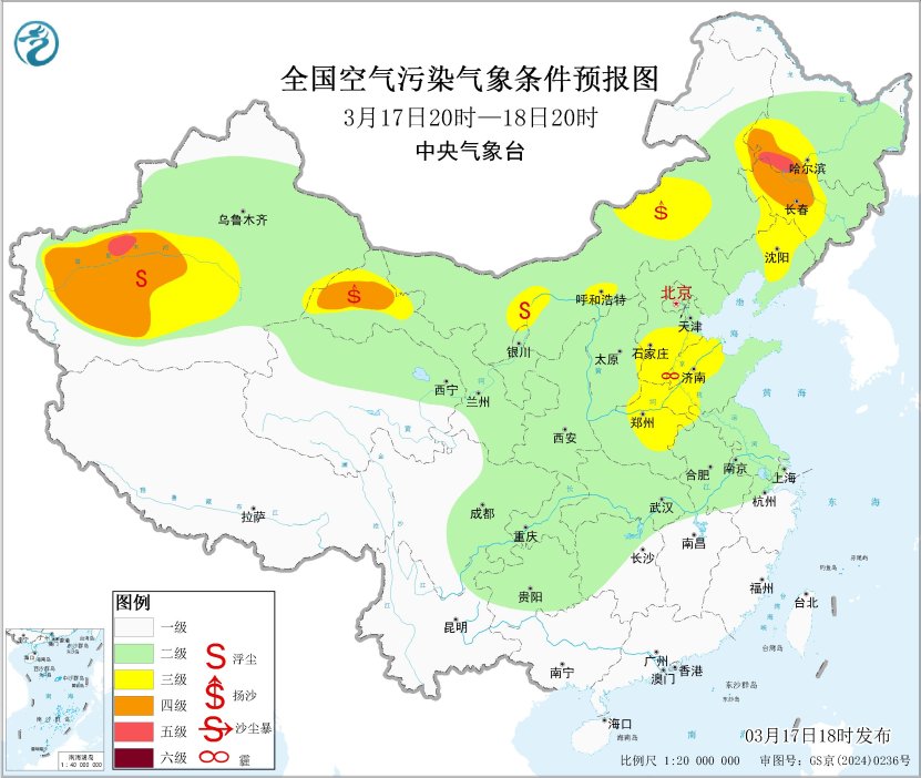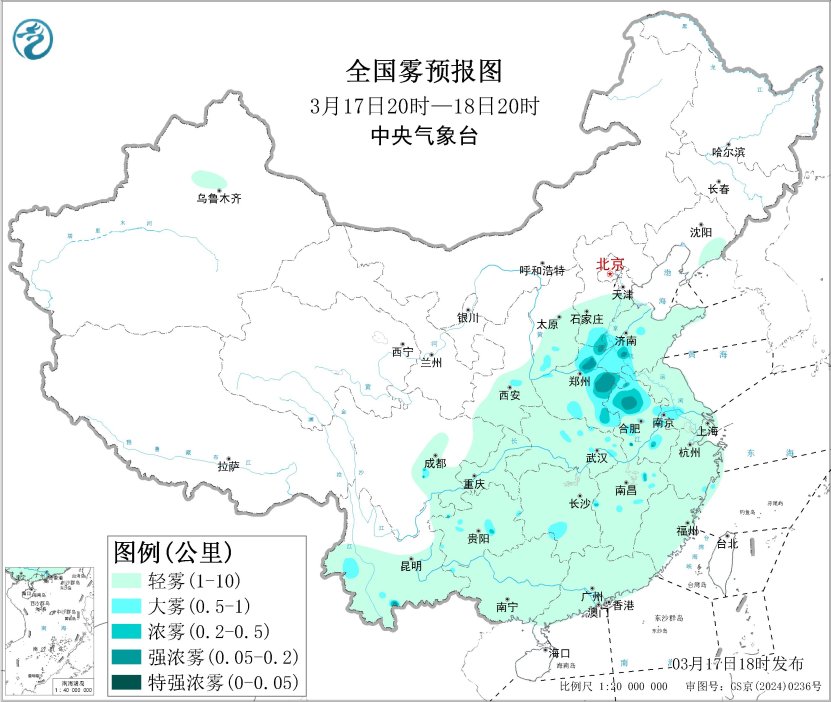 17昼夜间至18日上昼,华北南部、黄淮西部、江淮北部等地的部分地区有大雾天气,局地有能见度低于200米的强浓雾。